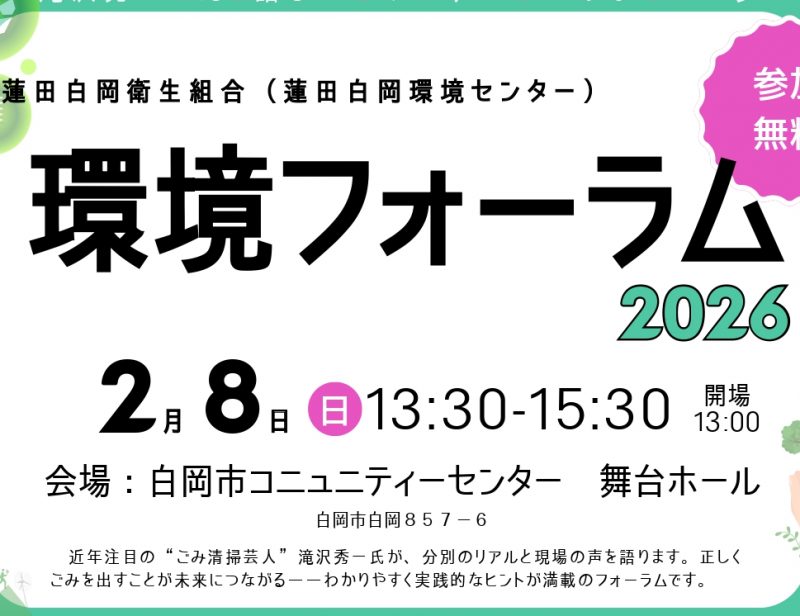 環境フォーラム2026開催!【参加無料】 近年注目の”ごみ清掃芸人”滝沢秀一氏が、分別のリアルと現場の声を語ります。正しくごみを出すことが未来につながるーーわかりやすく実践的なヒントが満載のフォーラムです。参加無料! 開催日:2月8日(日)13:30ー15:3…