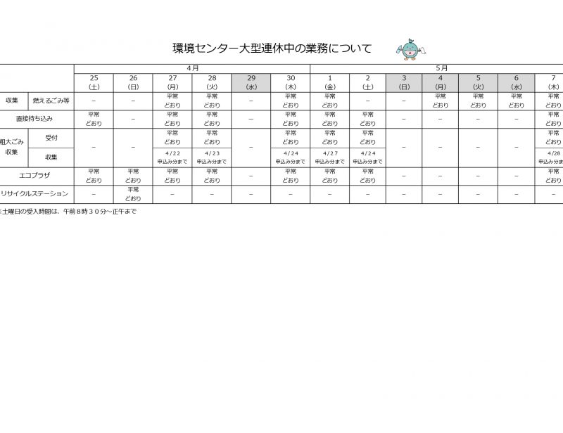 ゴールデンウィーク期間の業務についてお知らせ環境センターのゴールデンウィークの業務についてお知らせします。 ゴールデンウィークの環境センターへの直接持ち込みは大変混雑が予想されます。集積所に排出可能な品目については集積所をご利用いただき、直接持ち込みは時間に余裕を…