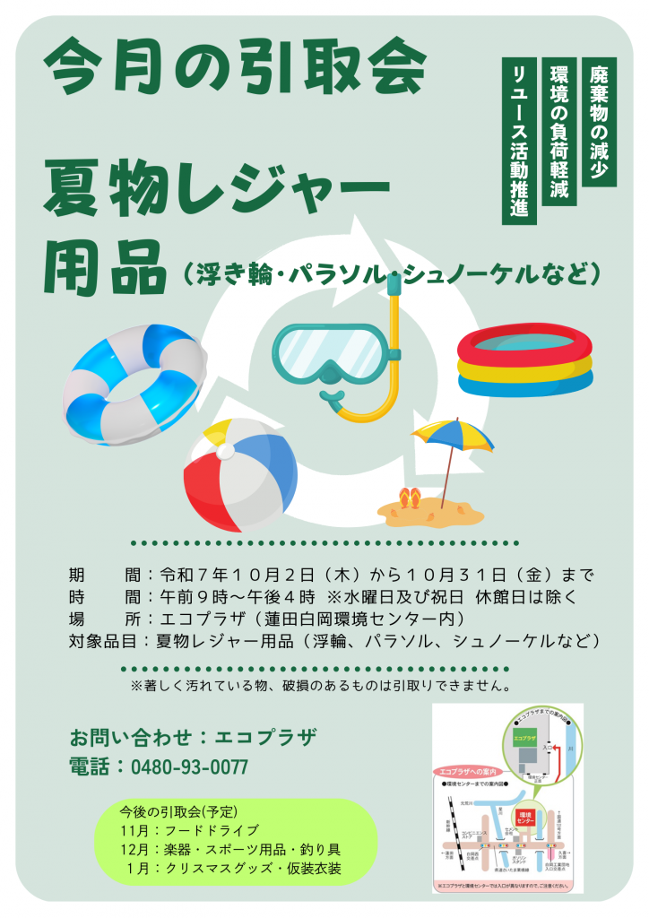 夏物レジャー用品引取会 ホーム > 新着情報 > イベント > 夏物レジャー用品引取会 公開日: 2025年9月26日 (更新日: 2025年9月29日) 期間令和7年10月2日(木)~31日(金)時間午前9時~午後4時場所蓮田白岡衛生組合 エコプラザお問合せ0480-93-0077