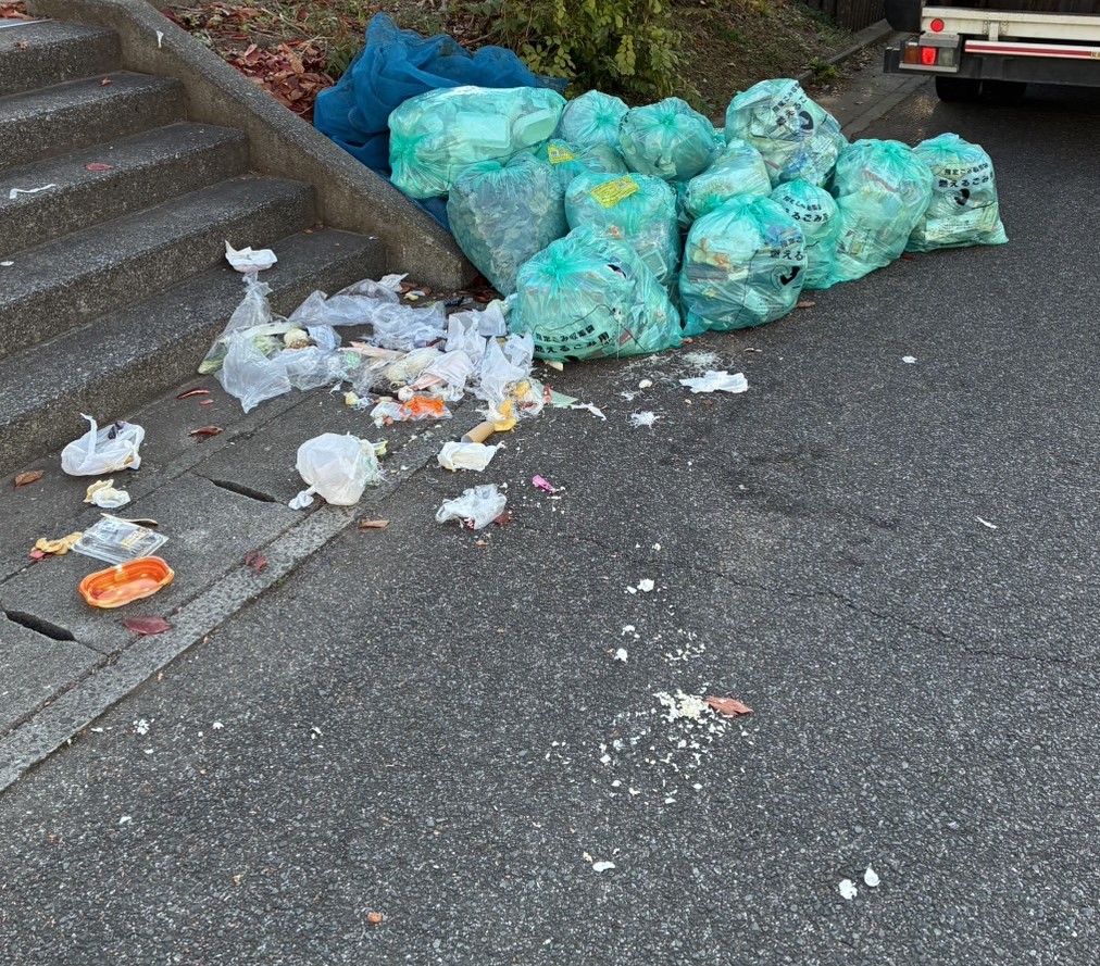 右:カラス除けネットを使用していないためカラスに荒らされた写真