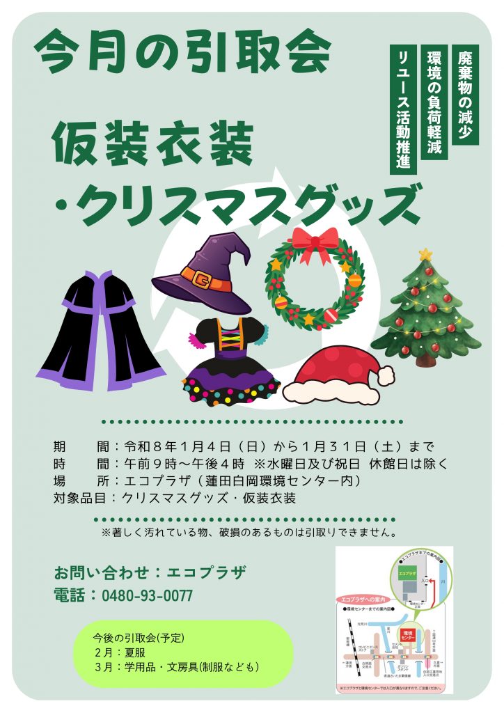 仮装衣装・クリスマスグッズ 引取会 ホーム > 新着情報 > イベント > 仮装衣装・クリスマスグッズ 引取会 公開日: 2025年12月25日 期間令和8年1月4日(日)~31日(土)時間午前9時~午後4時場所蓮田白岡衛生組合 エコプラザお問合せ0480-93-0077