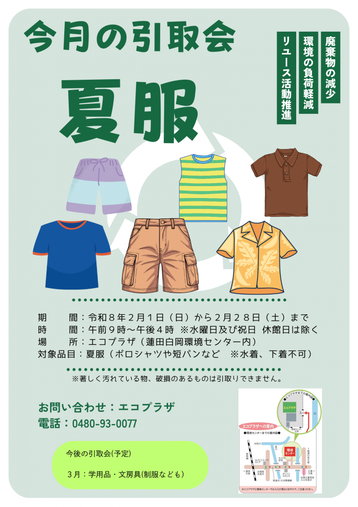 夏服 引取会 ホーム > 新着情報 > イベント > 夏服 引取会 公開日: 2026年1月30日 期間令和8年2月1日(日)~28日(土)時間午前9時~午後4時場所蓮田白岡衛生組合 エコプラザお問合せ0480-93-0077